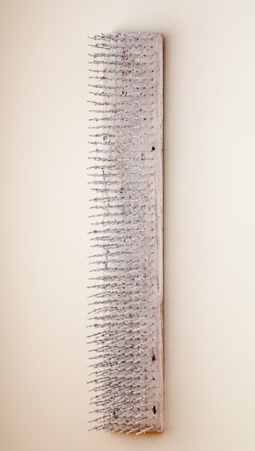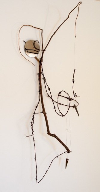 Exploits the constraining property of barbed wire as a unifying metaphor in each piece, Admasian repurposes other materials like fencing, willow switches, logs, butterflies, rooster feathers, and other found objects collected from flea markets and the rural Vermont landscape to create sculptures, public installations and assemblages that address how societal and psychological restraints both contain and free us.