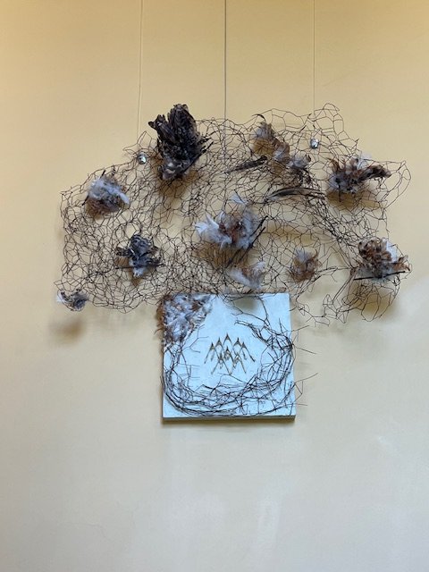 “Captured Wings” 2014, 54x72x8, Maple branches, barbed wire, feathers, and acrylic paint
