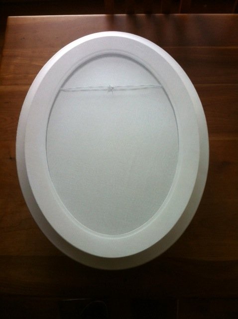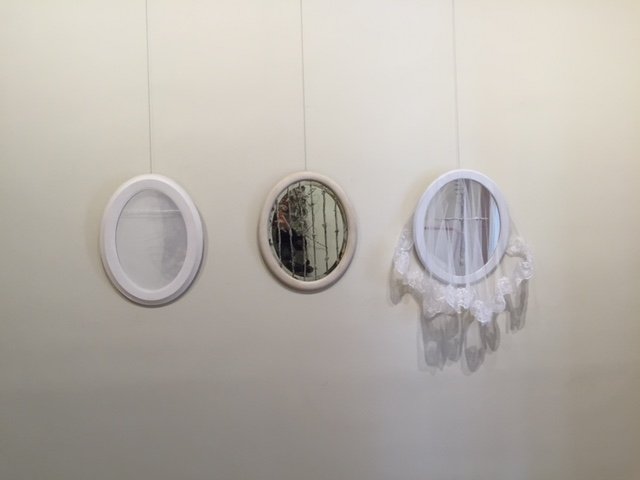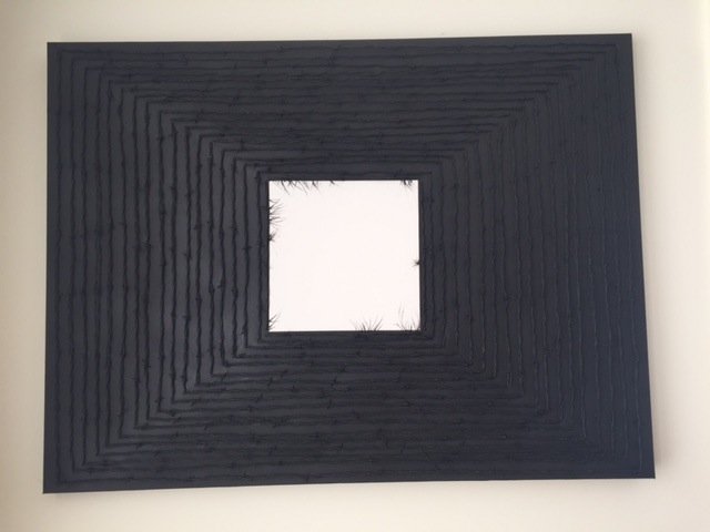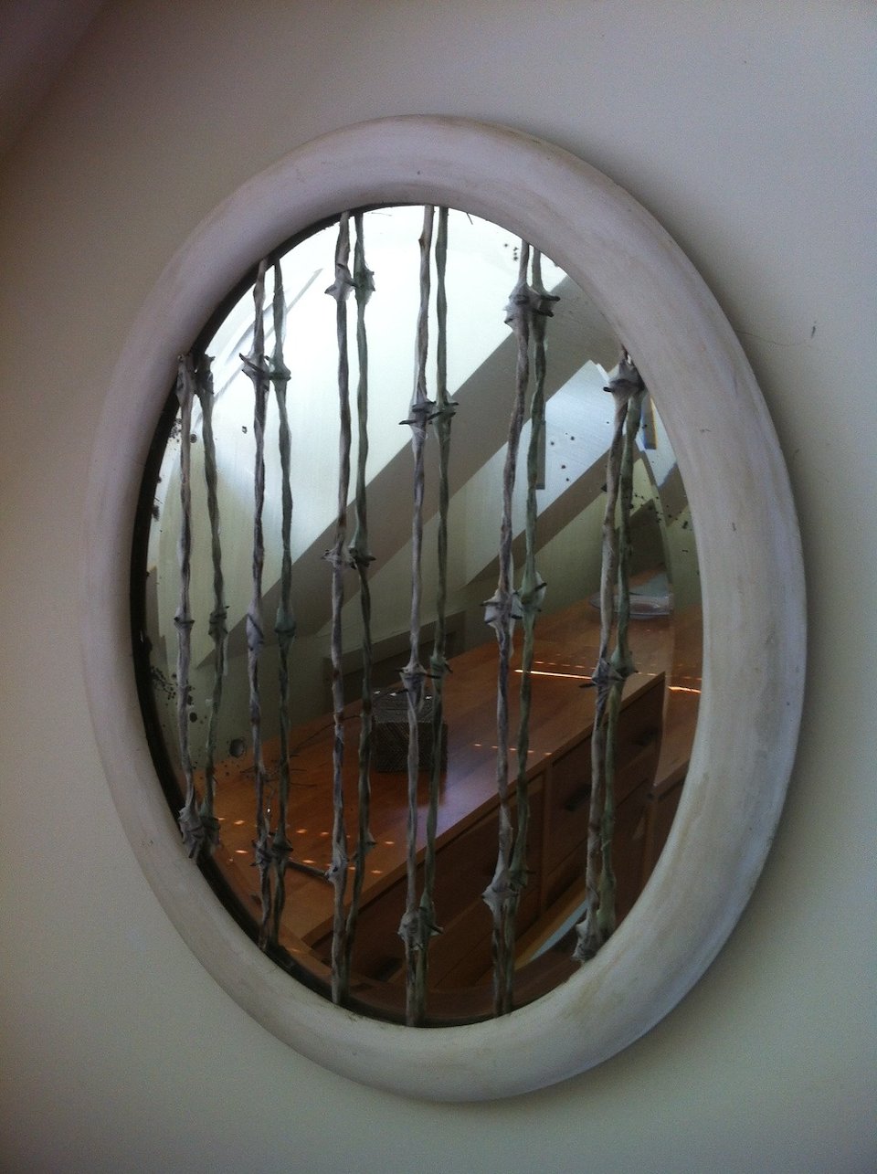 “Love Thyself” 2014, 19x23, vintage wooded mirror, white wash, silk covered barbed wire