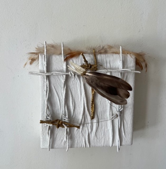 After the Henhouse, 2020-2024, 43x27x8", chicken-wire, rooster feathers, barbed wire, chicken wishbones, birch panel, acrylic,molding paste