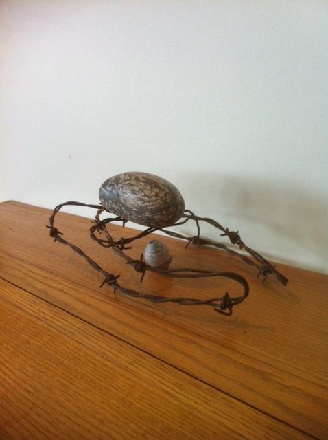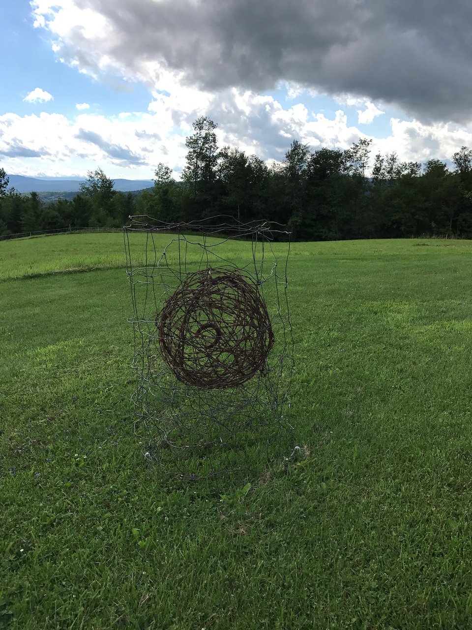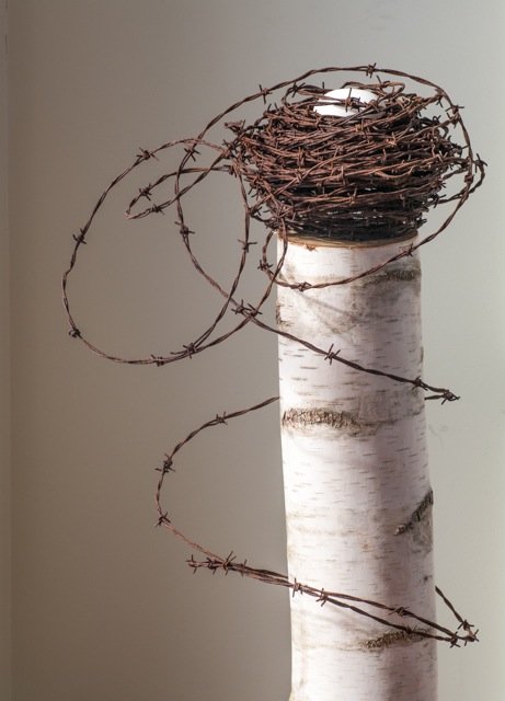 “The Nest”, 2014, 21x47x16, Barbed wire, goose egg, Vermont birch log and stove trivet