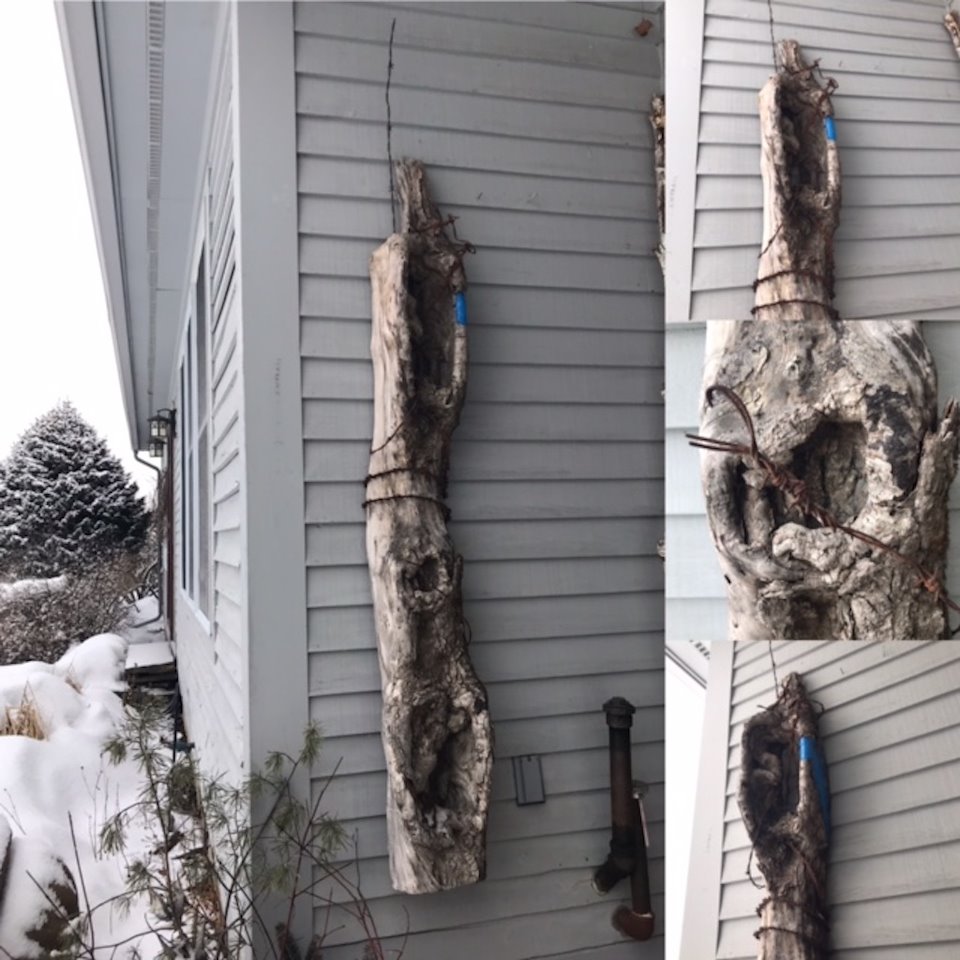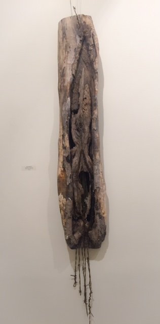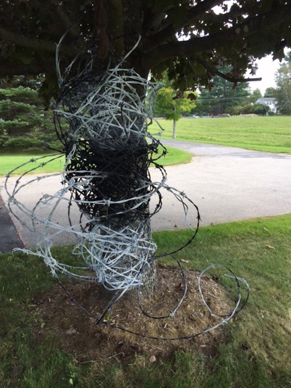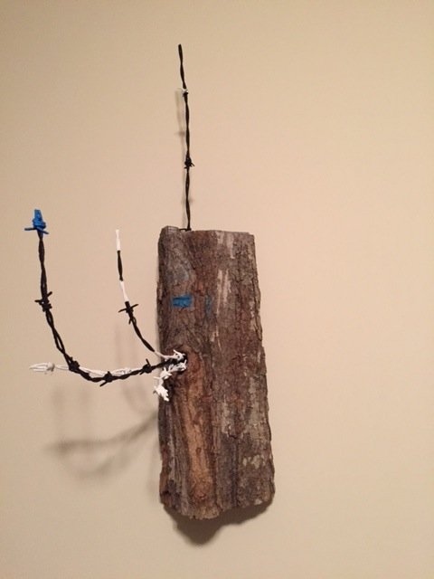 “Marked” 2015, 8x27x16, Maple log, barbed wire, and acrylic paint