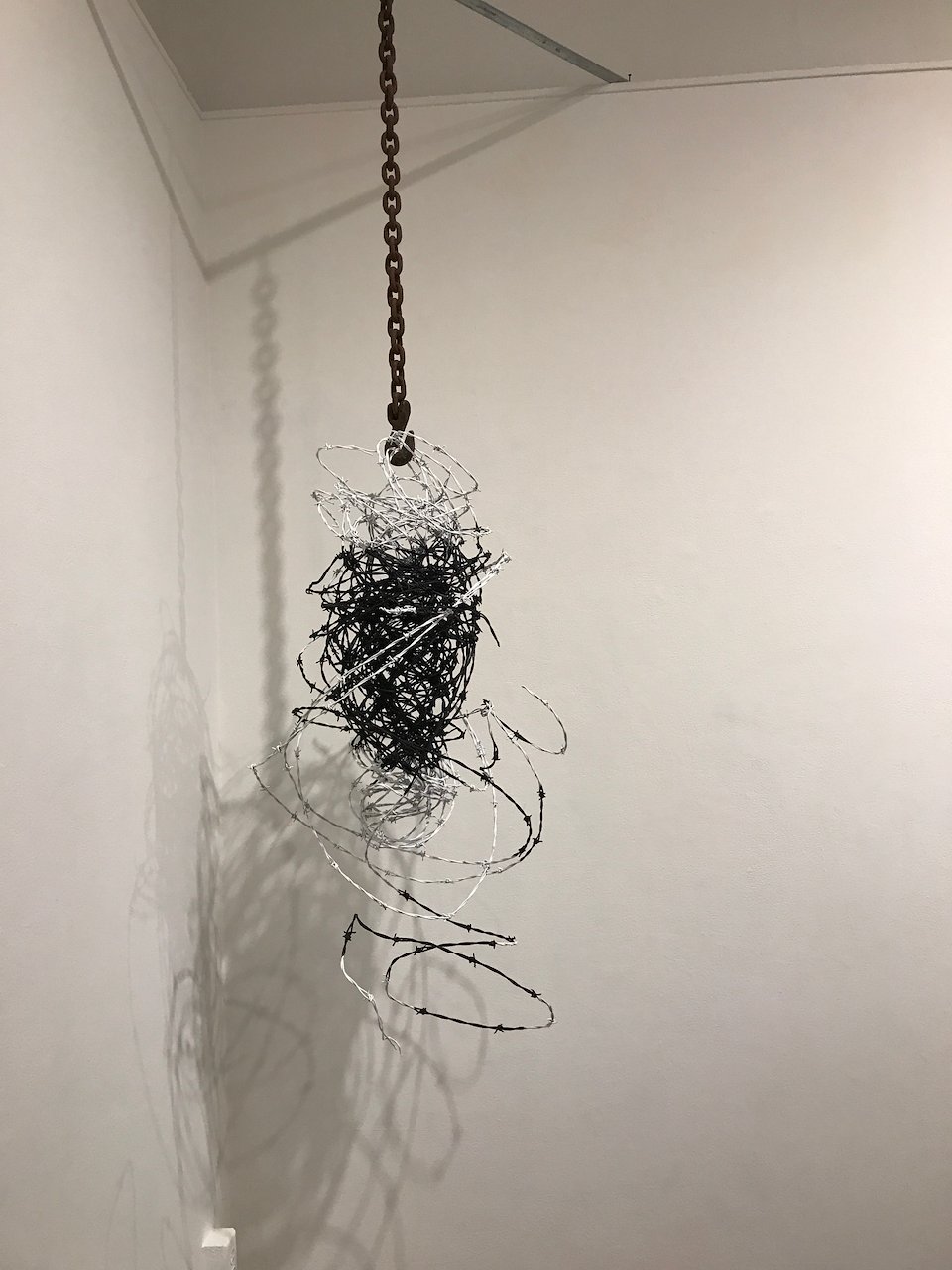 “The Hive” (exterior shot) 2016, 48x30x30, Barbed wire, acrylic and powder-coating, rusted chain (size length can vary)