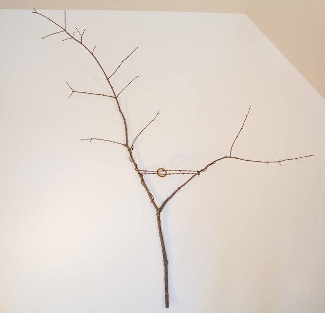 Dowsing for Center, 215, 64x85, Maple branch, barbed wire, rusted metal ring, white paint