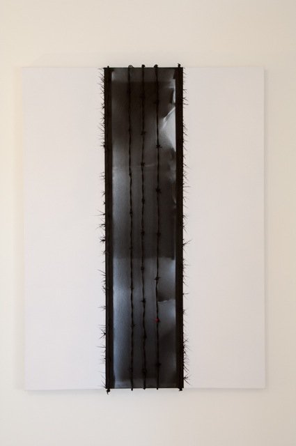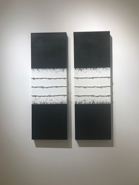 barbed wire on canvas, acrylic, and spray paint on canvas