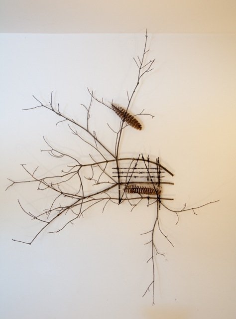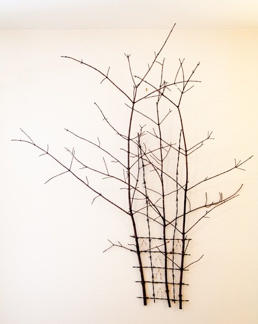“Five Wishes” Materials: Maple branches, barbed wire, chicken wishbones, wire, and white acrylic paint, 61"Hx53"W, 2015