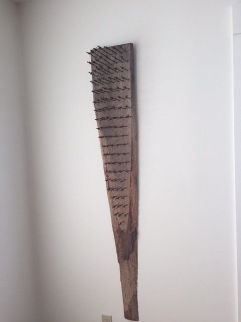 “Progression” 2015, 10.50x64x8, Barn plank and barbed wire