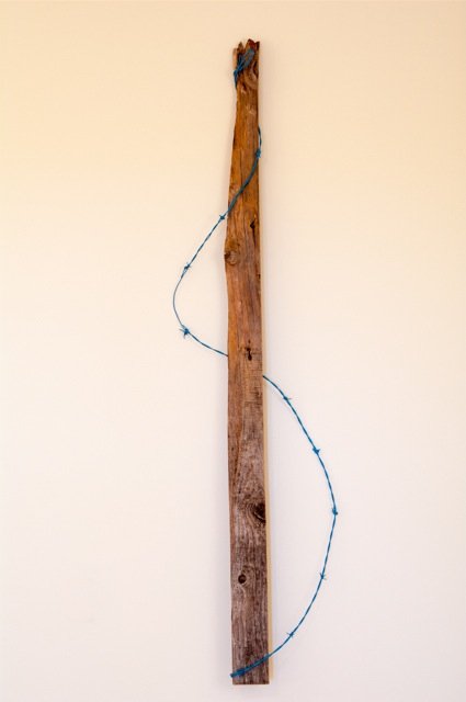 “Thin Blue Line”, 2014, 20x67, fence post, paint, and barbed wire,