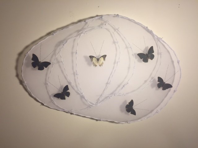"Lost innocence” 2015, 9X18, barbed wire, Charaxes butterfly, netting, and thread