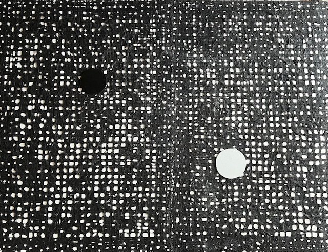 Seeking Totality, 2024, 40x31x1" birch panel, wooden disks, Gossamer paper, acrylic