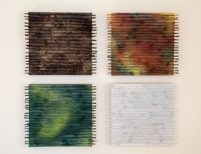 “Seasons” 2015, 30x28, barbed wire on canvas, acrylic, spray paint, dirt, and mica flakes, (All four pieces hung as seen)