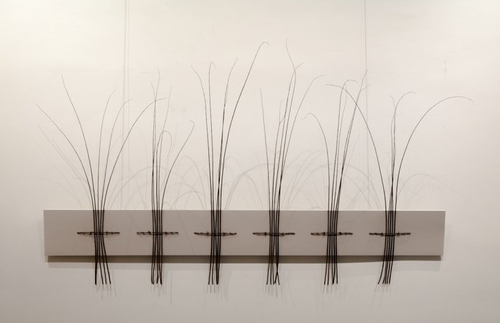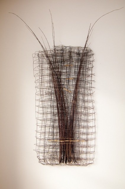 “Go Cut Yourself a Switch”, 2014, 96x60x1.25, willow switches, barbed wire on wooden panel