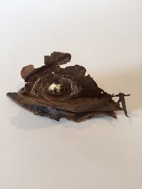 “Too Soon to Sail”, 2016, 10x5x3.50, birds nest, gold and blue thread, rusted metal, barbed wire, bark