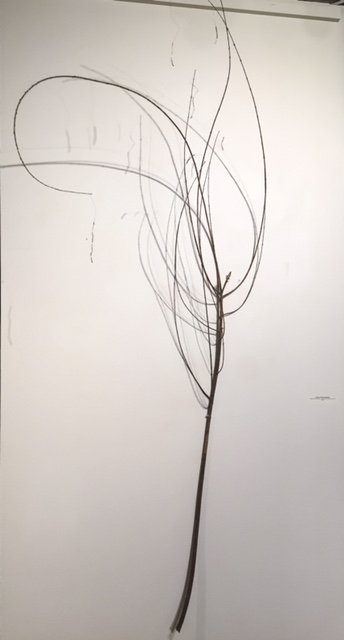 Dance of the Inchworm, 34 x 60", silver wire, gold painted barbed wire and a willow branch, 2016
