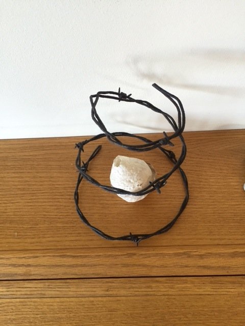 “Nature Over Nurture”, 2014, 5.5x12x5 rock, hornets' nest, and barbed wire