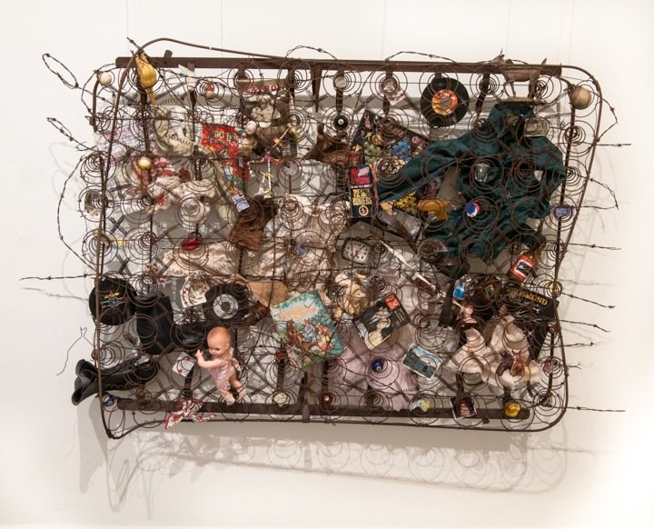 Rusted Box-spring, barbed wire and assorted mixed media and found objects