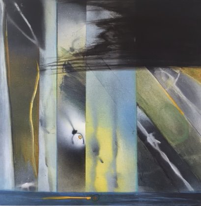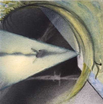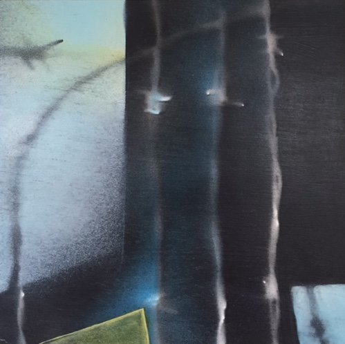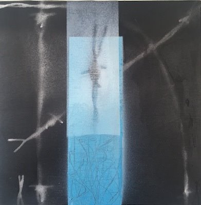 Passing Through, 14 x 14”, acrylic and spray paint, watercolor pencil, on birch panel,
