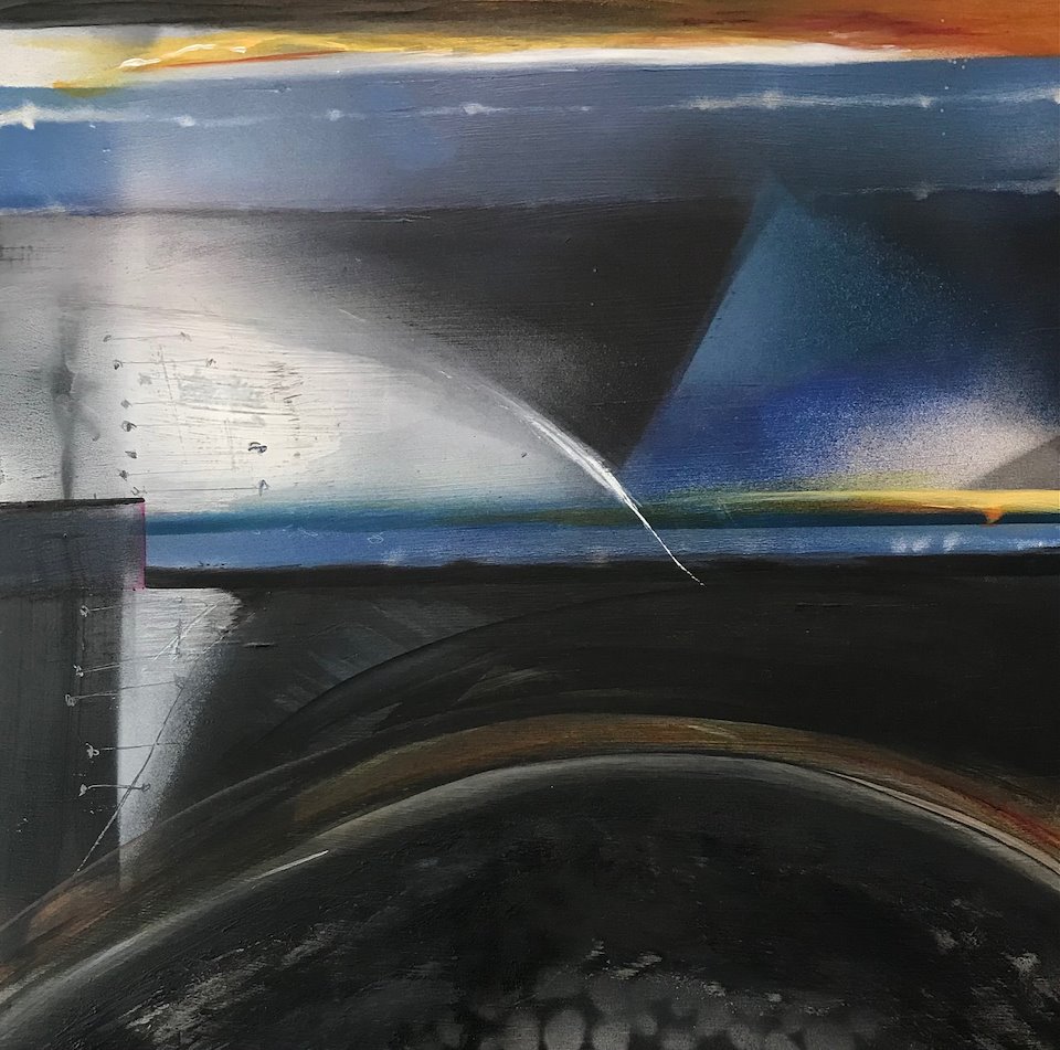 Night Train, 24x24", acrylic and spray paint, watercolor pencil, on birch panel