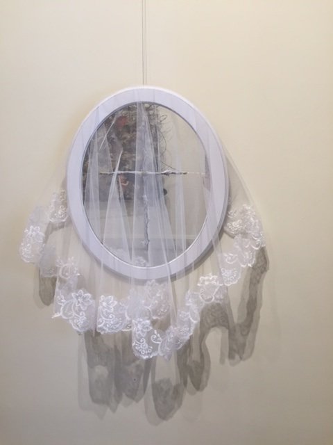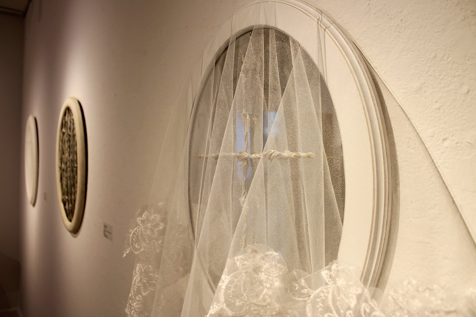 Mary Admasian, Blessed, Materials: barbed wire, silk, gold wire and a white Hispanic wedding vale, 38"Hx28"W, 2014