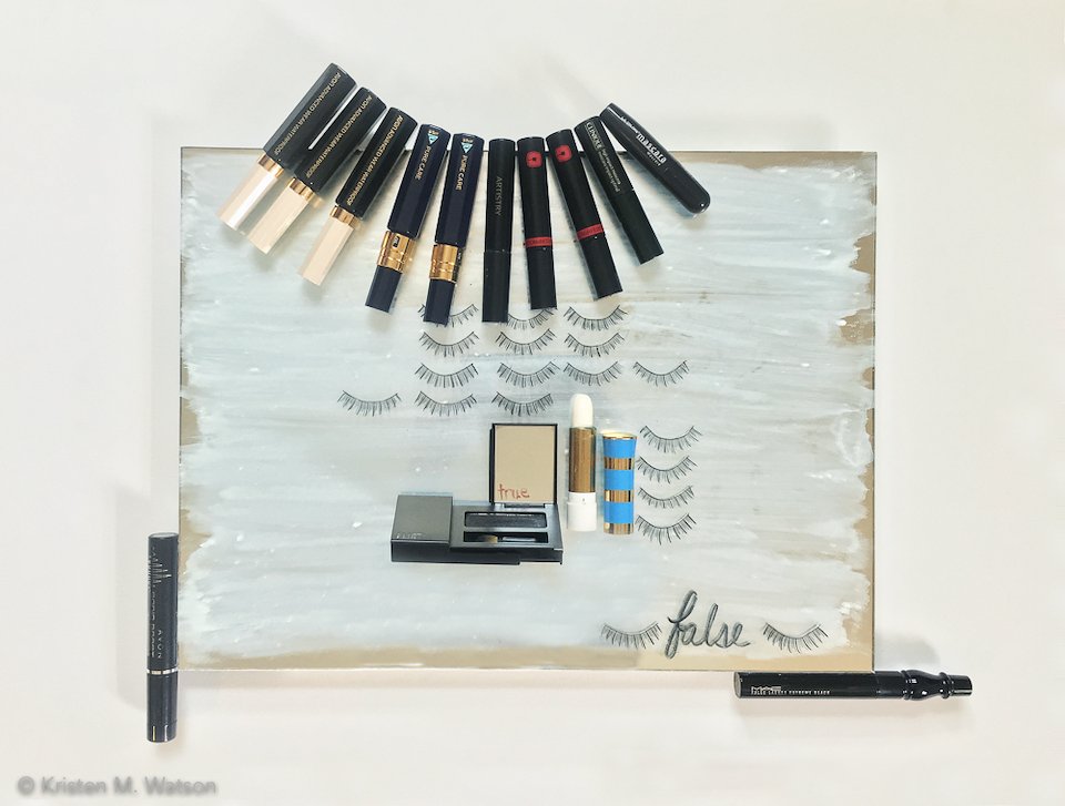 Kristen M. Watson, True/False, mirror, gesso, compact lipstick, mascara, false eyelashes, 2016