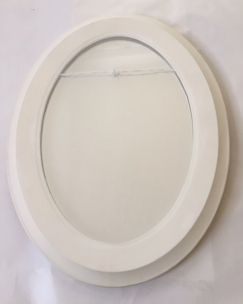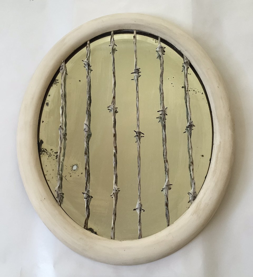 Mary Admasian, Love Thy Self, Materials: vintage mirror, barbed wire with wrapped silk, 19"Hx25"L, 2014