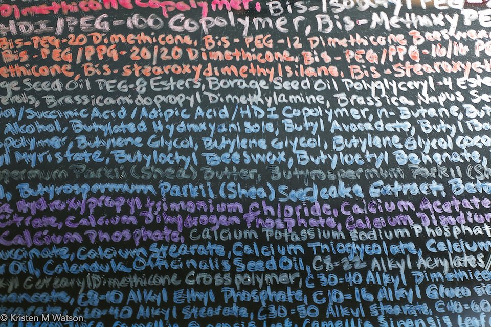 Kristen M. Watson, rəˈflekt, detail of Installation on mirrors with lists of cosmetic ingredients, 2016