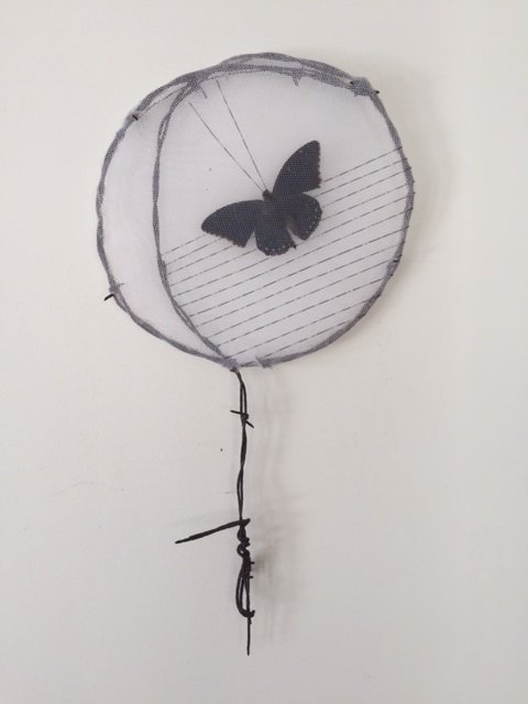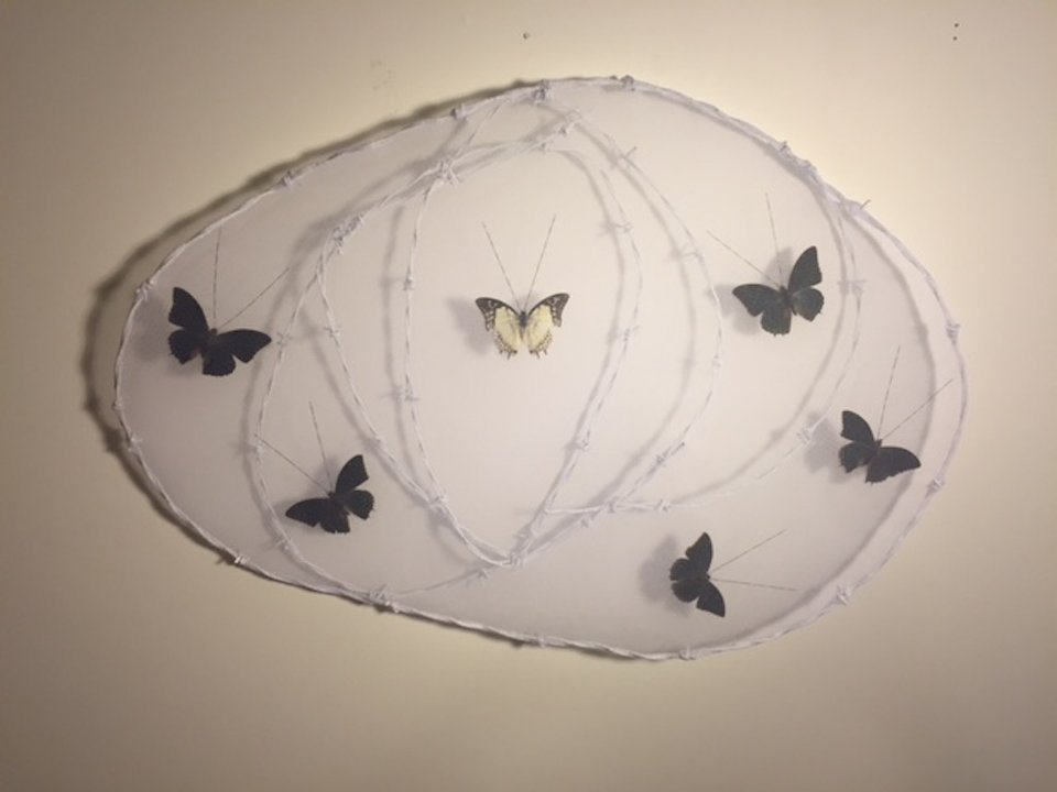 Mary Admasian, “Lost Innocence” Materials: Barbed wire, Charaxes butterfly, barbed wire, netting, and thread, Size: 9"WX18"L, 2015