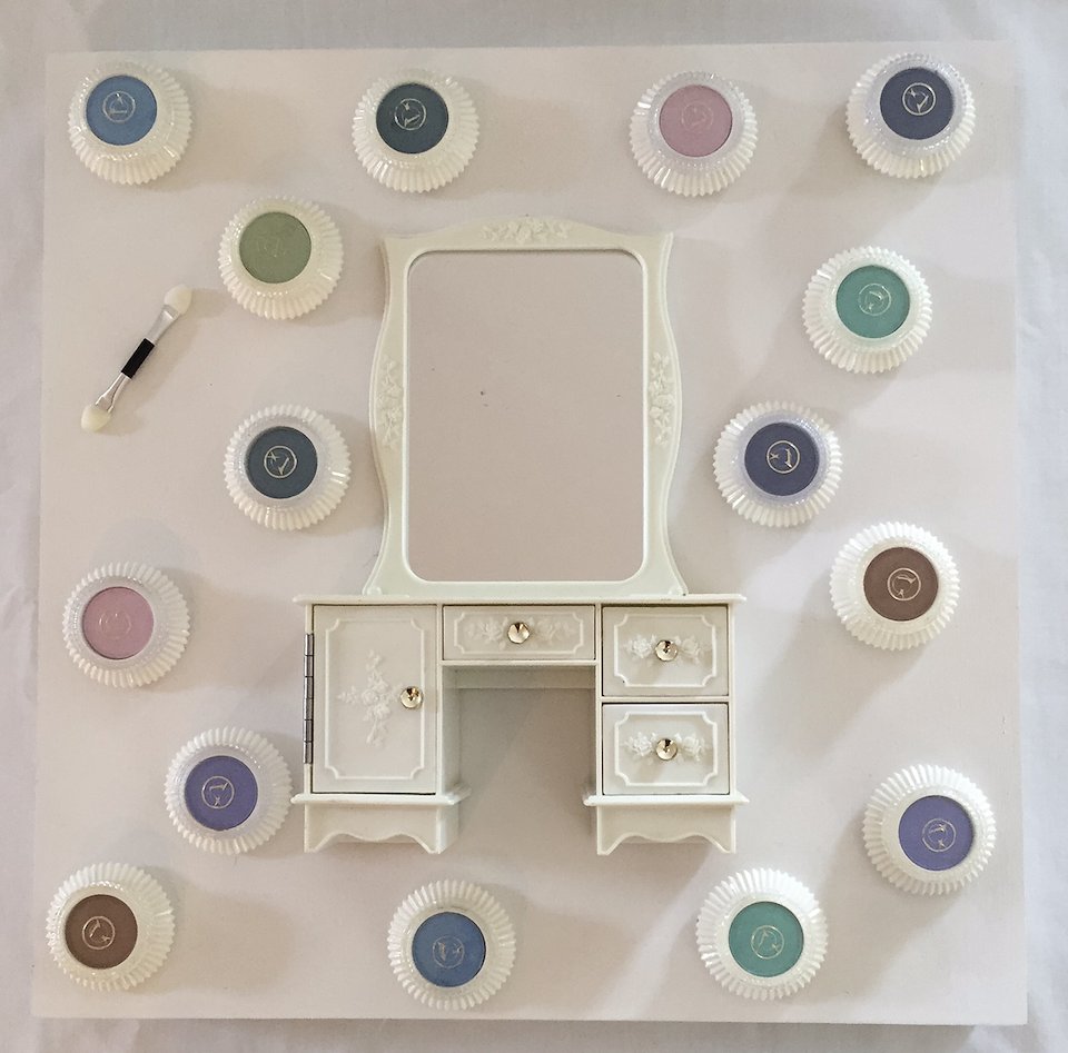 Mary Admasian, Eyeview, tiny vanity, eyeshadow and applicator on birch panel, 14"x14", 2016