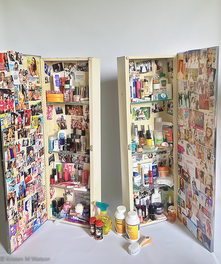 Kristen M. Watson, Her life (from the cabinet), 2016, health and beauty products, medicine cabinets, digital print collage, 35 x 11.5 x 4 inches each.