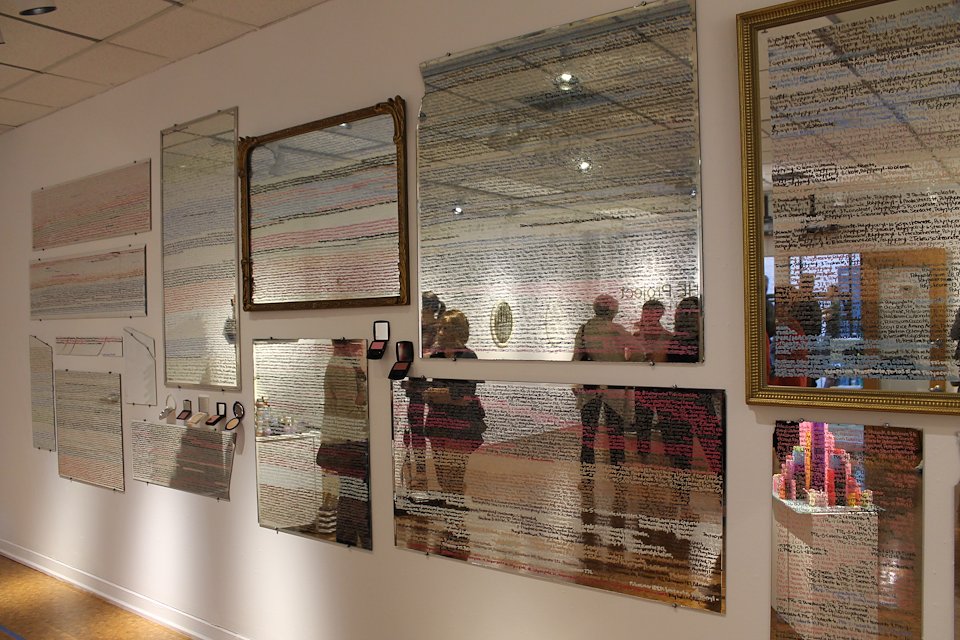 Kristen M. Watson, rəˈflekt detail of Installation on mirrors with lists of cosmetic ingredients, 2016