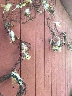 (From 2018 Sculpture Fest) The Path to the Henhouse, 14'Lx3'H, painted chicken wire, gold painted barbed wire and steel wire