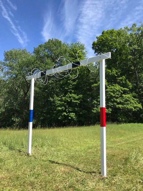 2018-2021 Sculpture Fest –Titled: High Hurdle" – there is no getting over it… 10'x10', 2018 made from wood, acrylic paint and barbed wire