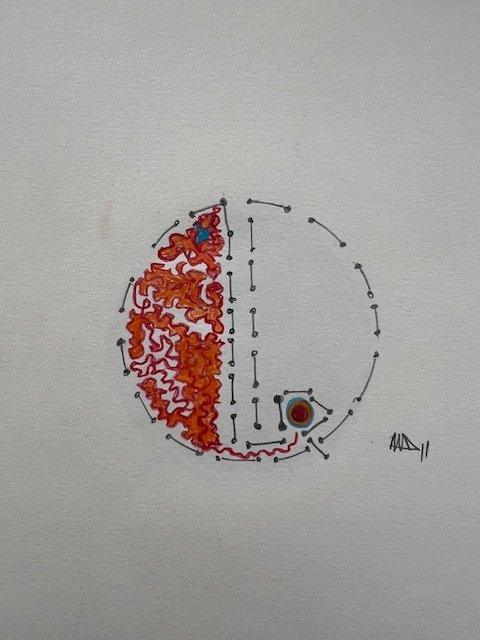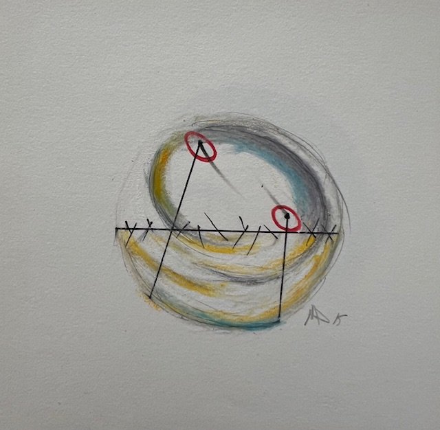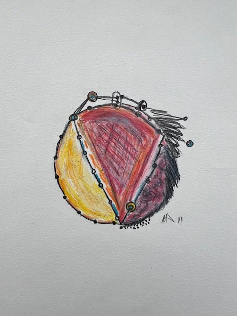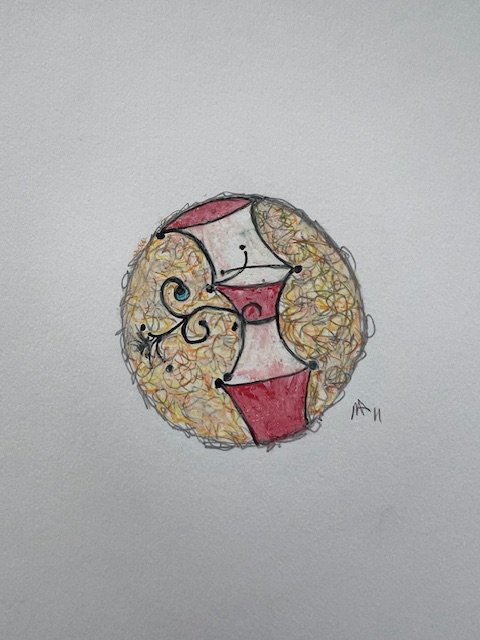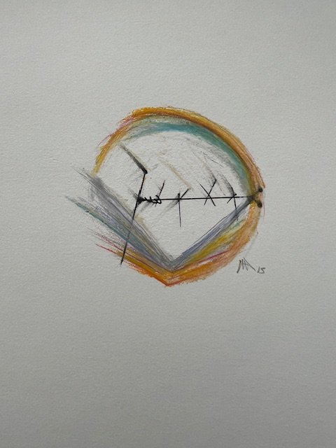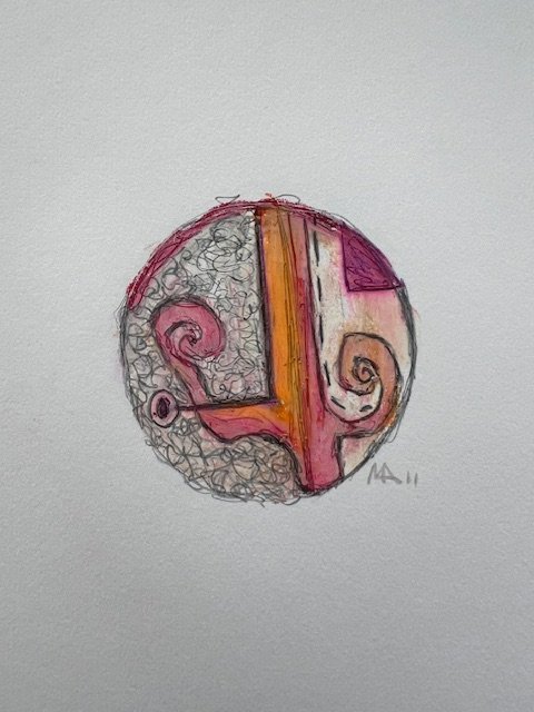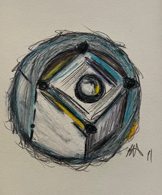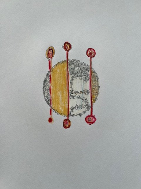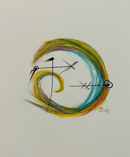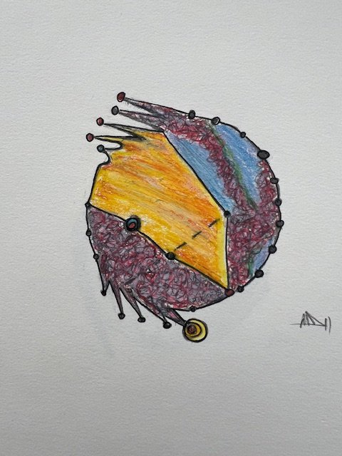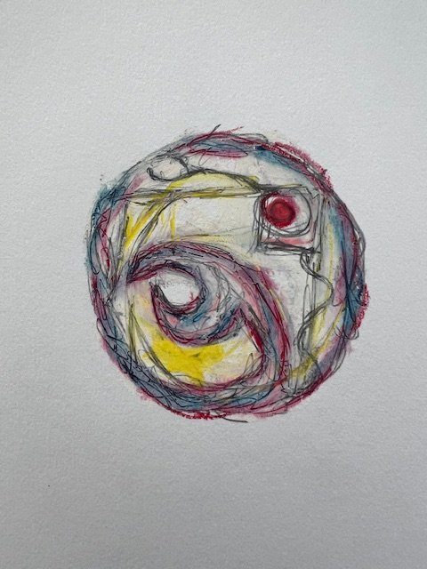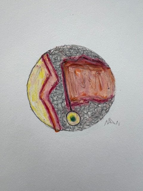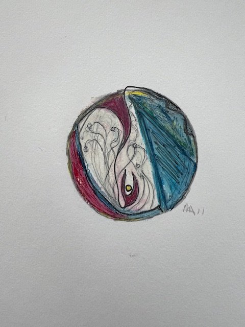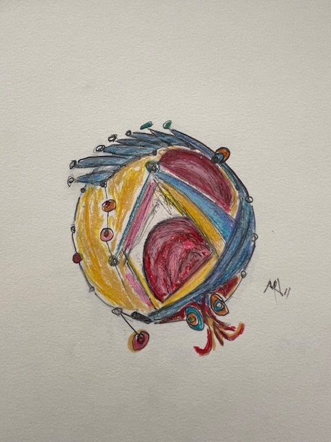 Orbiting Circles, 10 X10" framed, oil pastel, graphite, colored pencil on paper, 2011